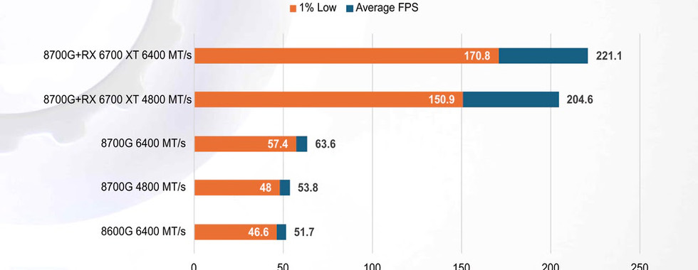 When we bring the RX 6700 XT into the mix, the performance jumps dramatically. Paired with the 8700G, the setup sees over a 200% increase in performance compared to the integrated graphics alone. With faster 6400 MT/SÂ memory, the improvement is even more pronounced.Â