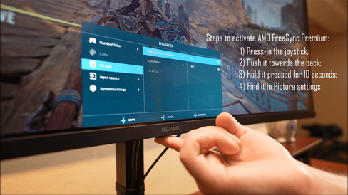 Huawei also advertises AMD FreeSync Premium, but it is switched off by default. We actually struggled to find it in the settings so after a quick chat with their tech team we found the hidden option. To enable this in the menu - you have to press in the joystick, push it towards the back and hold it for 10 seconds. I am not exactly sure why it is hidden, but if you buy this unit - this is the way.