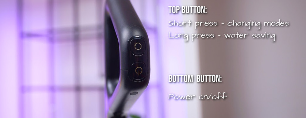 Moving on to the handle – it has all the main controls. Up on the very top it has the self-cleaning button, at the front it has the button for changing the modes, and by long-pressing it you can choose to stay in or exit water saving mode. Then there’s the power button, and on the inside it has a fancy looking gold button for Spot Spray function.