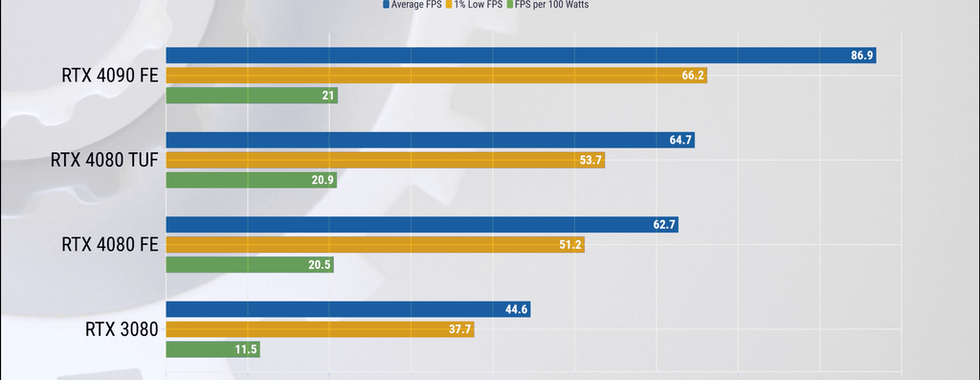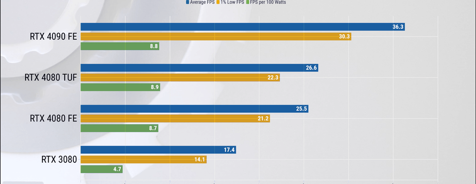In Cyberpunk 2077 we also maxed out the settings and pushed Ray Tracing to what they call Psycho Mode and here these cards get properly punished. With these settings it's not really a pleasant experience on either one of the cards. With this in mind, ASUS card is 4.1% faster than Founders Edition and RTX 4090 is leading the pack with 36.5% more FPS on average.