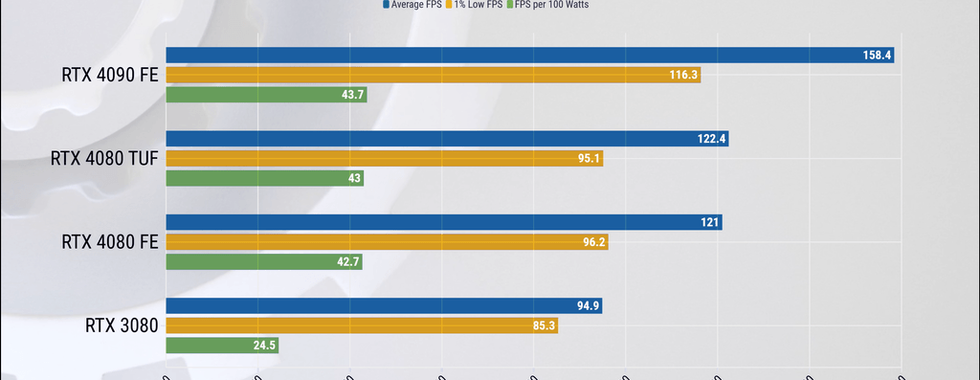 With the full DLSS suite of features enabled, the game becomes playable again and this is the first time Founders Edition card is actually performing better than TUF Gaming. It had 3.4% lead on average FPS and 1.2% on 1 percentiles. RTX 4090 is 31.2% faster than 4080 FE here.