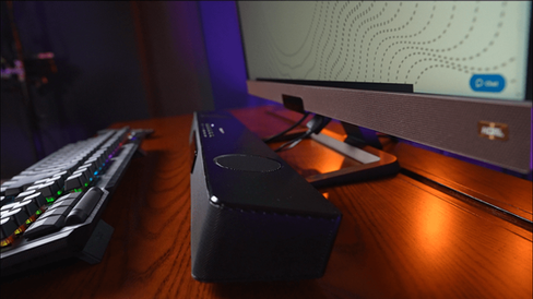 If you place the soundbar in front of the monitor - this creates a sound bubble due to the top firing speaker angle as they are pointing slightly backwards. It makes the sound reflect and feel like it is coming from the screen.